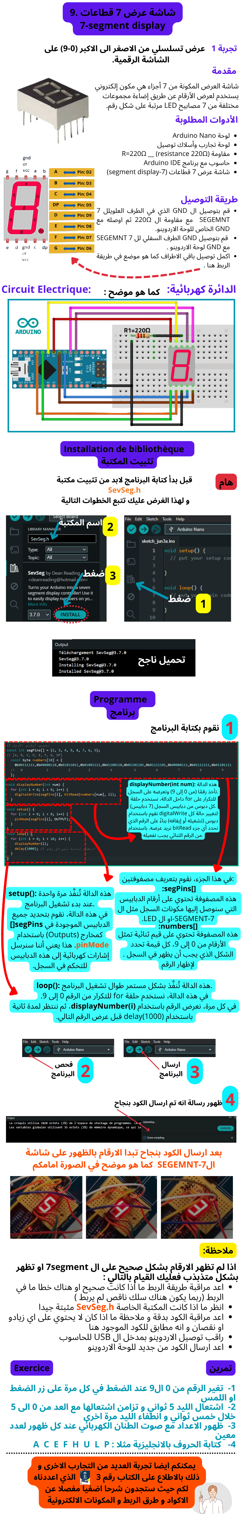 في هذه المرحلة الاخيرة سنتعلم كيفية عرض الأرقام على شاشة الرقمية المتكونة من سبعة أجزاء مع معرفة توصيلها مع أردوينو وبرمجته لعرض المعلومات الرقمية كما نراها في الساعات أو الأجهزة الأخرى